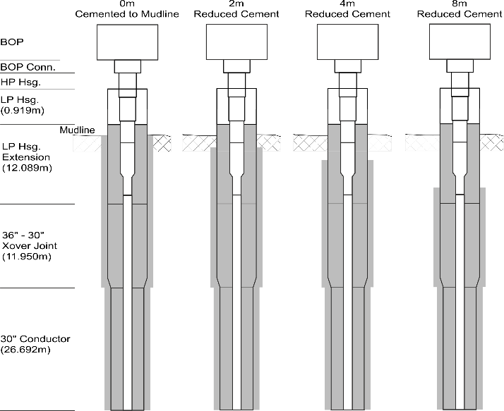 It is also prudent during the well planning stage that the potential for a cement shortfall is considered. Analysis is performed by AS Mosley to investigate the effect of either an external cement shortfall and/or a shortfall between the surface casing and conductor. Figure 1 provides an example of an external cement shortfall which can occur during well construction where cement returns to mudline are not achieved.